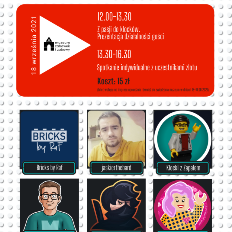 W Muzeum Zabawek i Zabawy pojawią się: Bricks by Raf, jaskierthebard, Klocki z Zapałem, Maciek i Klocki, Pudi Ninja, Woman_in_Brickworld.