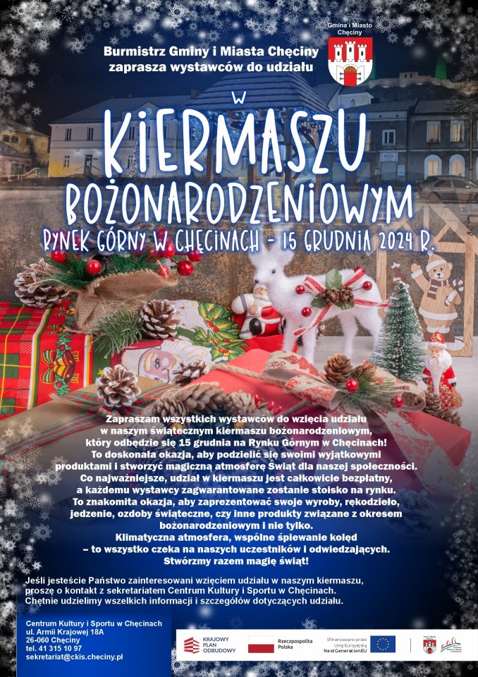 Burmistrz Gminy i Miasta Chęciny serdecznie zaprasza na kiermasz bożonarodzeniowy, który odbędzie się 15 grudnia na Rynku Górnym w Chęcinach.