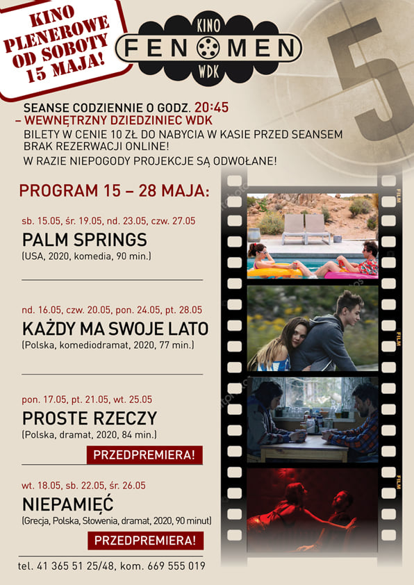 Kino Fenomen WDK zaprasza na codzienne seanse filmowe od soboty 15 maja do piątku 28 maja, które będą miały miejsce w wewnętrznym dziedzińcu WDK o godz. 20:45.