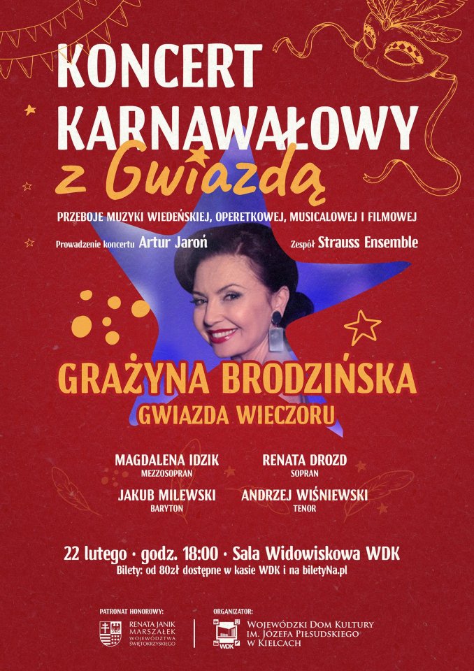 Sala Widowiskowa Wojewódzkiego Domu Kultury im. Józefa Piłsudskiego w Kielcach zamieni się w prawdziwe królestwo dźwięków za sprawą niezapomnianego koncertu Karnawałowego z Gwiazdą, który dostarczy emocji i wzruszeń na najwyższym poziomie.