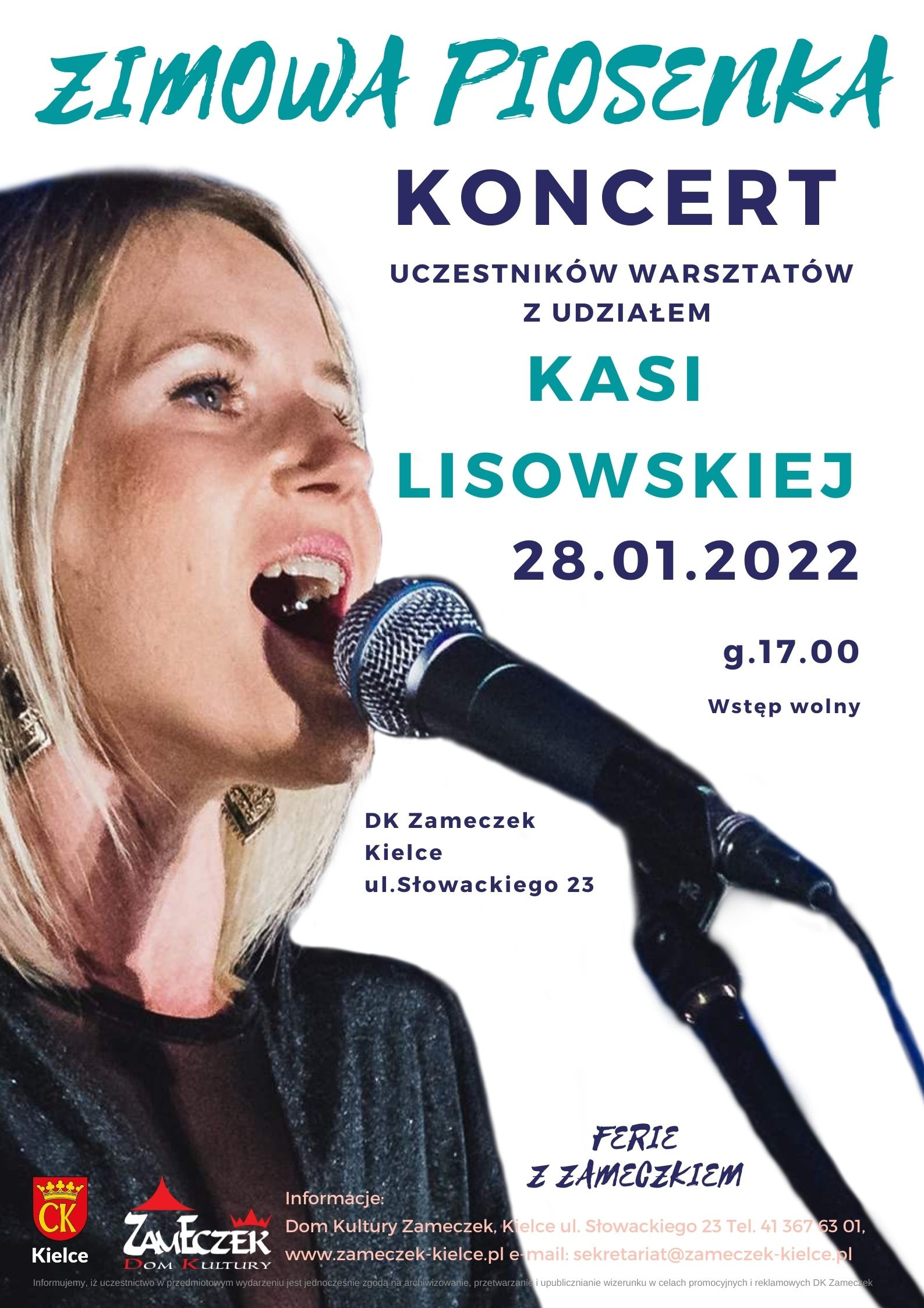 Dom Kultury Zameczek zaprasza na Koncert Uczestników Warsztatów Feryjnych z udziałem Katarzyny Lisowskiej. Wstęp wolny. Koncert będzie podsumowaniem warsztatów feryjnych pod wodzą Mai Wojtaszek oraz zaproszonego gościa czyli Kasię Lisowską.