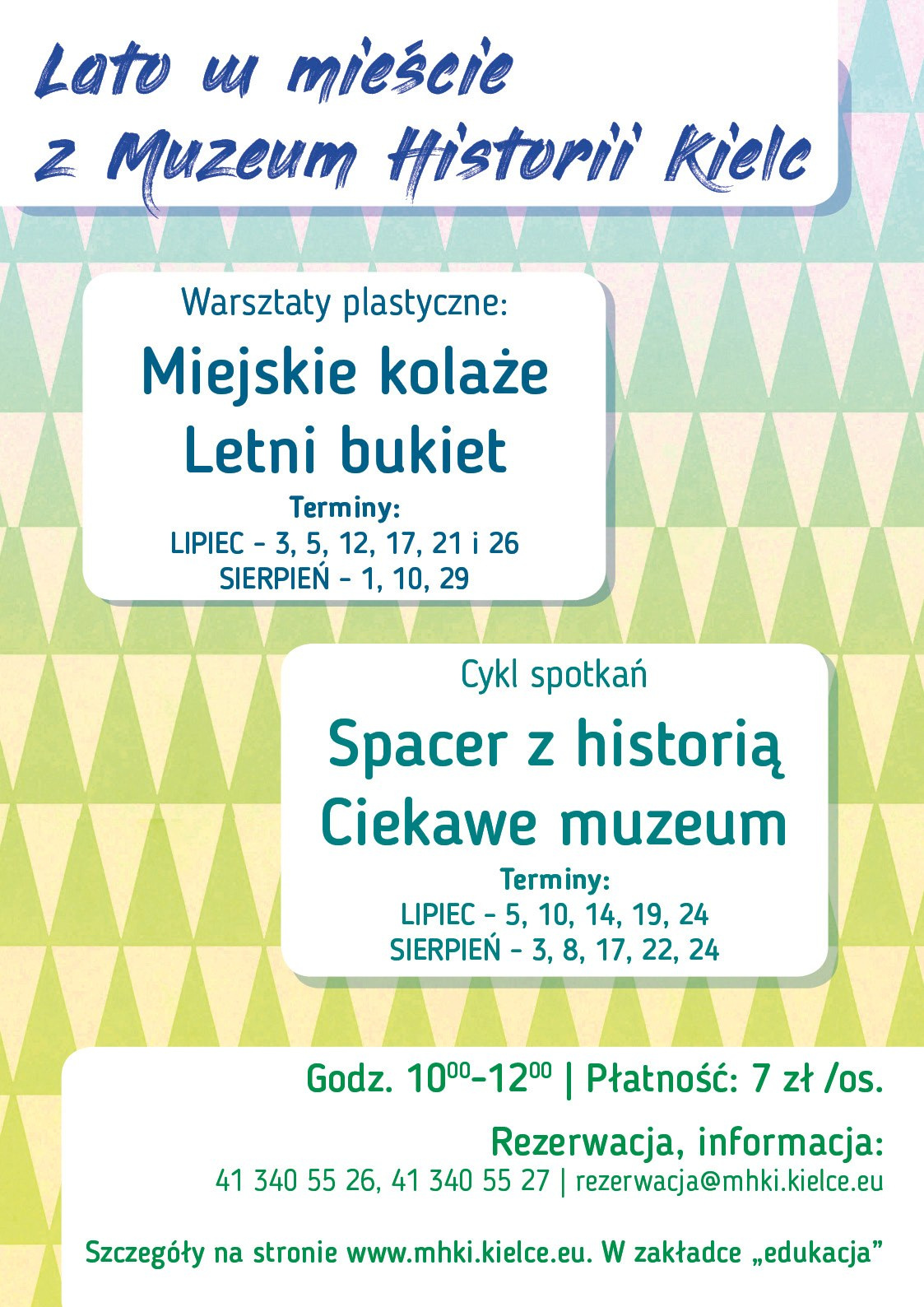 - Ze względu na ograniczoną do 15 osób wielkość grup zajęciowych, prosimy o wcześniejszą rezerwację pod nr tel. 41 340 55 26 , email: rezerwacja@mhki.kielce.eu.