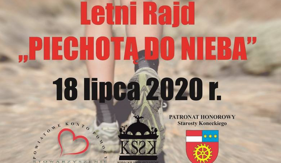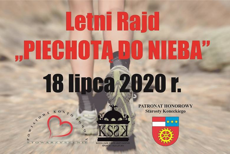 Stowarzyszenie „Powiatowe Konto Pomocy” oraz Koneckie Stowarzyszenie Sportu i Kultury wraz ze starostą koneckim, Grzegorzem Piecem zapraszają na Letni Rajd „Piechotą do Nieba”. Wydarzenie ma na celu przede wszystkim promocję walorów krajoznawczych Ziemi Koneckiej, rozpowszechnianie turystyki pieszej, oraz propagowanie aktywnego i zdrowego stylu życia. Rajd o dystansie 12 km rozpocznie się o godz. 10:00 w Końskich na Browarach. Limit uczestników ograniczony przepisami epidemicznymi. Aby wziąć udział należy wypełnić kartę zgłoszenia. Udział w wydarzeniu jest płatny - osoby pełnoletnie 20zł; dzieci i młodzież do 18-go roku życia - 10zł. Kontakt z organizatorem pod numerem 604 212 503.
