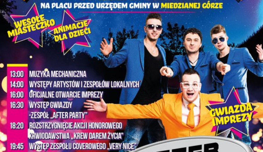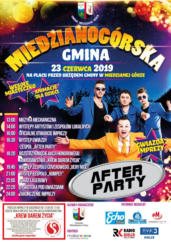 Moc atrakcji w Gminie Miedziana Góra! W niedzielę w centrum Miedzianej Góry odbędzie się festyn „Miedzianogórska Gmina 2019”. Gwiazdą tegorocznej edycji imprezy promocyjno- kulturalnej "Miedzianogórska Gmina 2019" będzie zespół "AFTER PARTY".