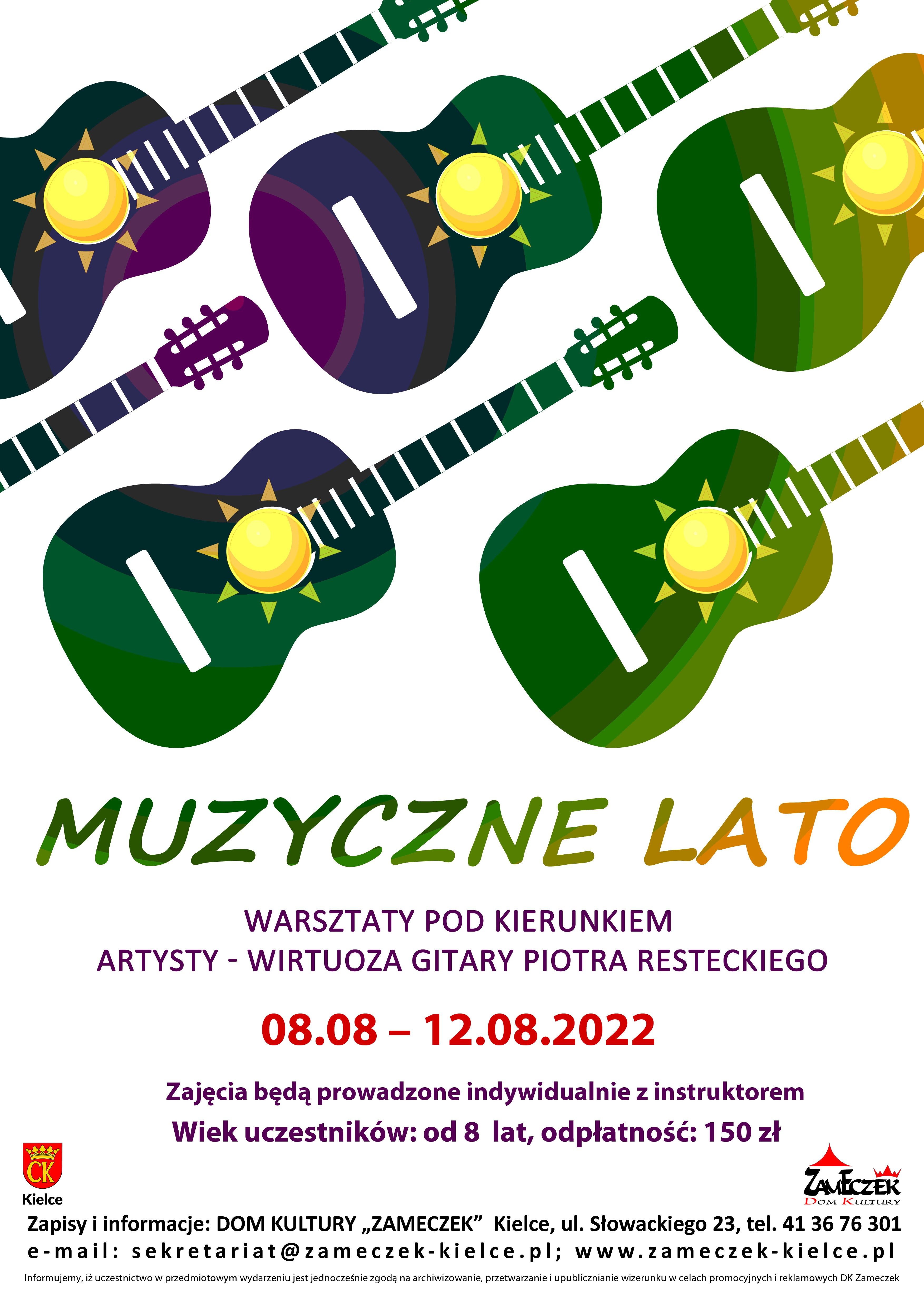 MUZYCZNE LATO - warsztaty gitarowe pod kierunkiem artysty, wirtuoza a zarazem instruktora Piotra Resteckiego, adresowane do osób chcących rozpocząć przygodę z gitarą. Zapraszamy również gitarzystów zainteresowanych rozwinięciem swoich umiejętności, którzy chcąc poszerzyć swoje muzyczne horyzonty i poznać tajniki fingerstylu czyli technika gry na gitarze, która porównywana jest do imitowania brzmienia całego