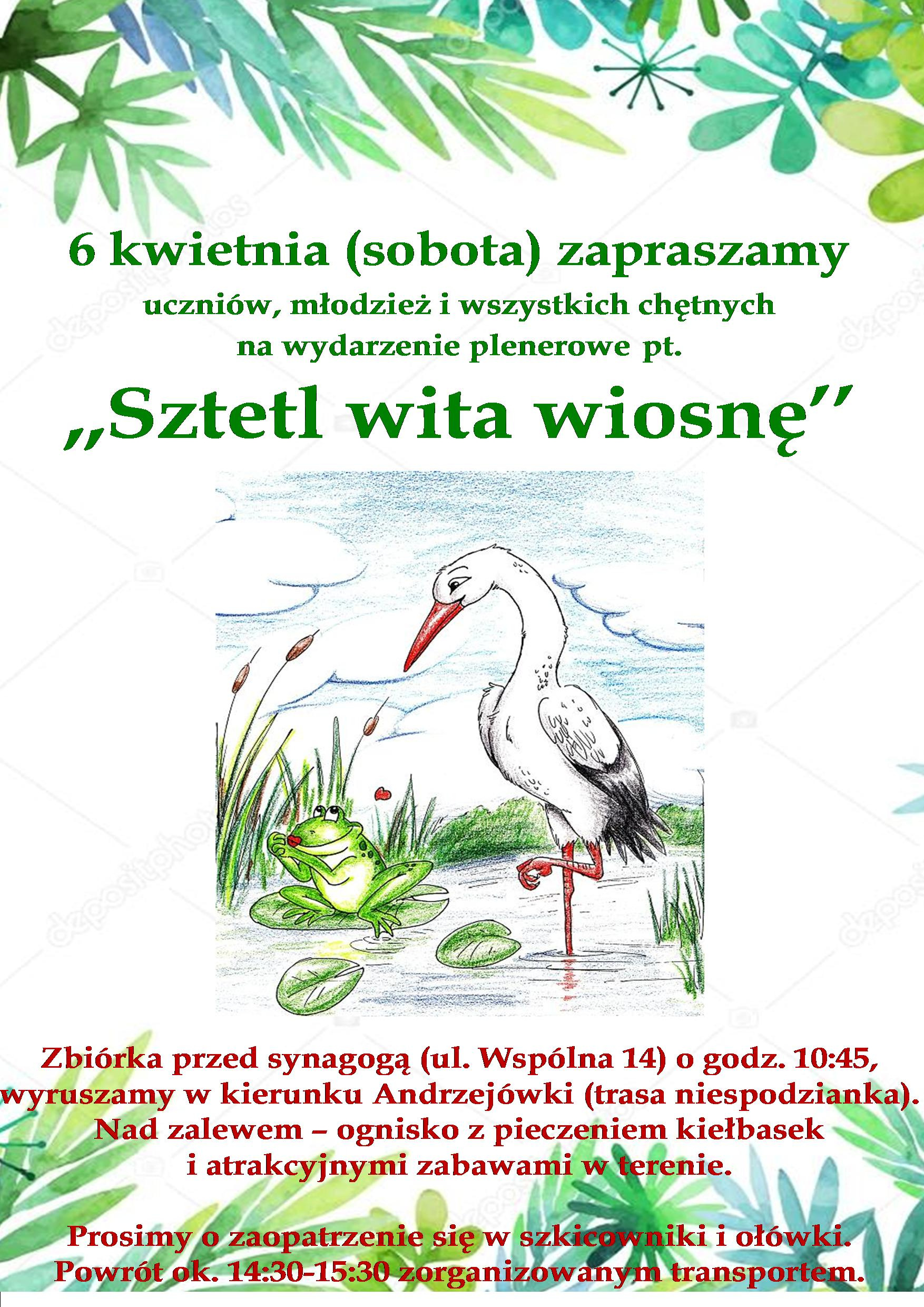 Zbiórka o godz. 10. 45 – przy synagodze w Chmielniku. Wychodzimy o godz. 11 – w kierunku zalewu „Andrzejówka”, ale okrężną trasą; na trasie przystanki – dla krótkich opowieści historycznych i wiosennych szkiców ołówkiem. Prosimy o zabranie ze sobą szkicowników i ołówków!