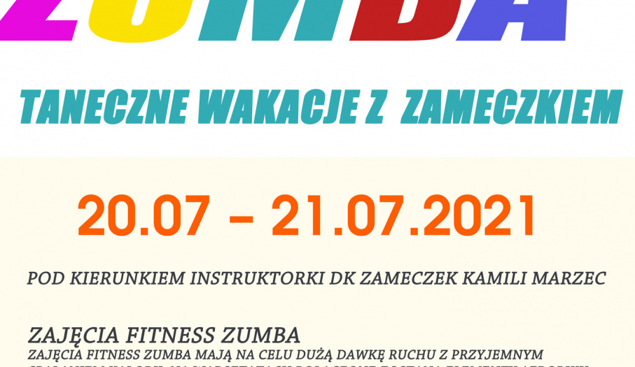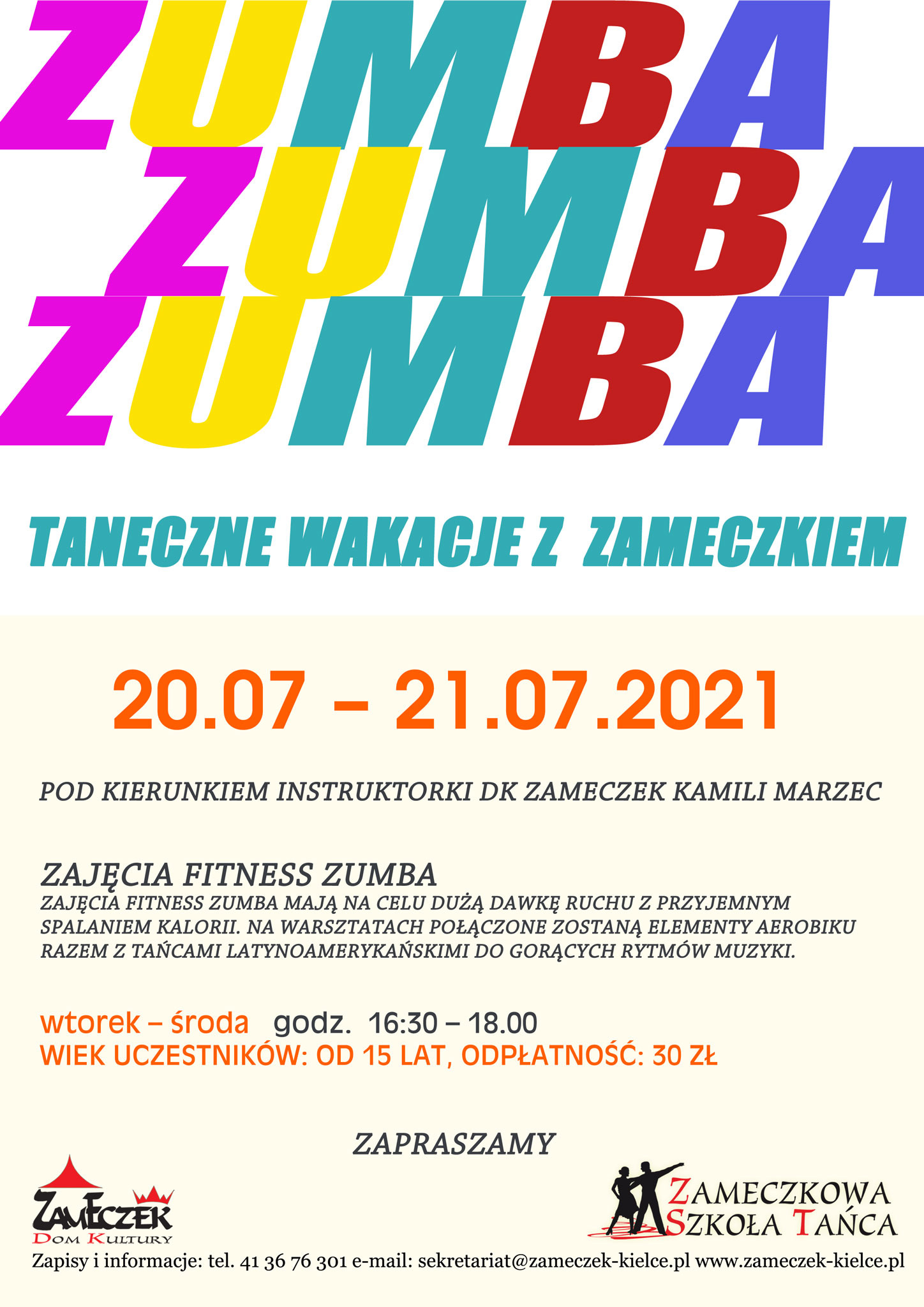 Dom Kultury Zameczek zaprasza na Taneczne wakacje z Zumbą, która poprowadzi instruktorka tańca Kamila Marzec. Zajęcia Fitness Zumba mają na celu dużą dawkę ruchu z przyjemnym spalaniem kalorii. Na warsztatach połączone zostaną elementy aerobiku razem z tańcami latynoamerykańskimi do gorących rytmów muzyki. Zajęcia odbędą się we wtorek oraz środę w godzinach od 16:30 do 18:00.