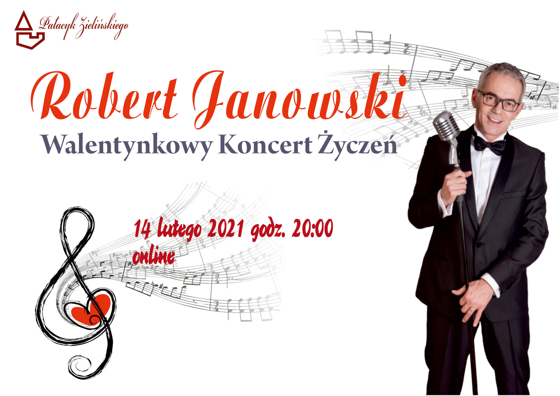Pałacyk Tomasza Zielińskiego zaprasza na kolejny koncert online. Tym razem na scenie w Państwa domach wystąpi Robert Janowski! Być może przeczyta on walentynkowe życzenia dla Twojej ukochanej osoby?
