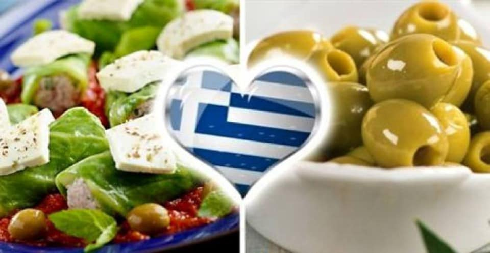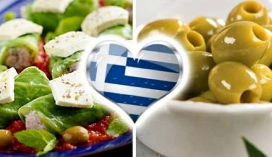 Świeże pomidory i ogórki, sałaty, greckie oliwy, suszone pomidory, oliwki, smażone sardele z cytryną, tzatzyki, dolmades, pasta z fasoli, pieczywo