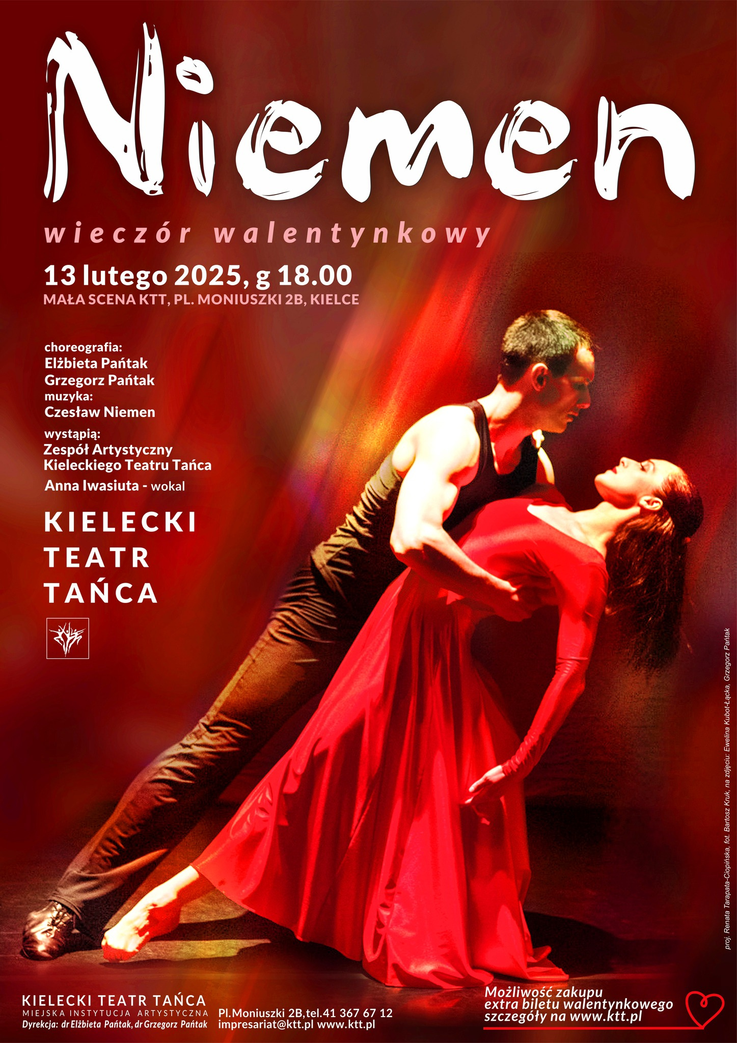 Artyści Kieleckiego Teatru Tańca zaprezentują spektakl pt. „Niemen”, w choreografii Elżbieta Pańtak i Grzegorz Pańtak, gdzie taniec łączy się z utworami Czesława Niemena. To sentymentalna podróż – pełna miłości, tańca i muzyki. Podczas wieczoru wystąpią artyści Kieleckiego Teatru Tańca oraz aktorka Anna Iwasiuta, która zaśpiewa wyjątkowe utwory z miłością w tle.