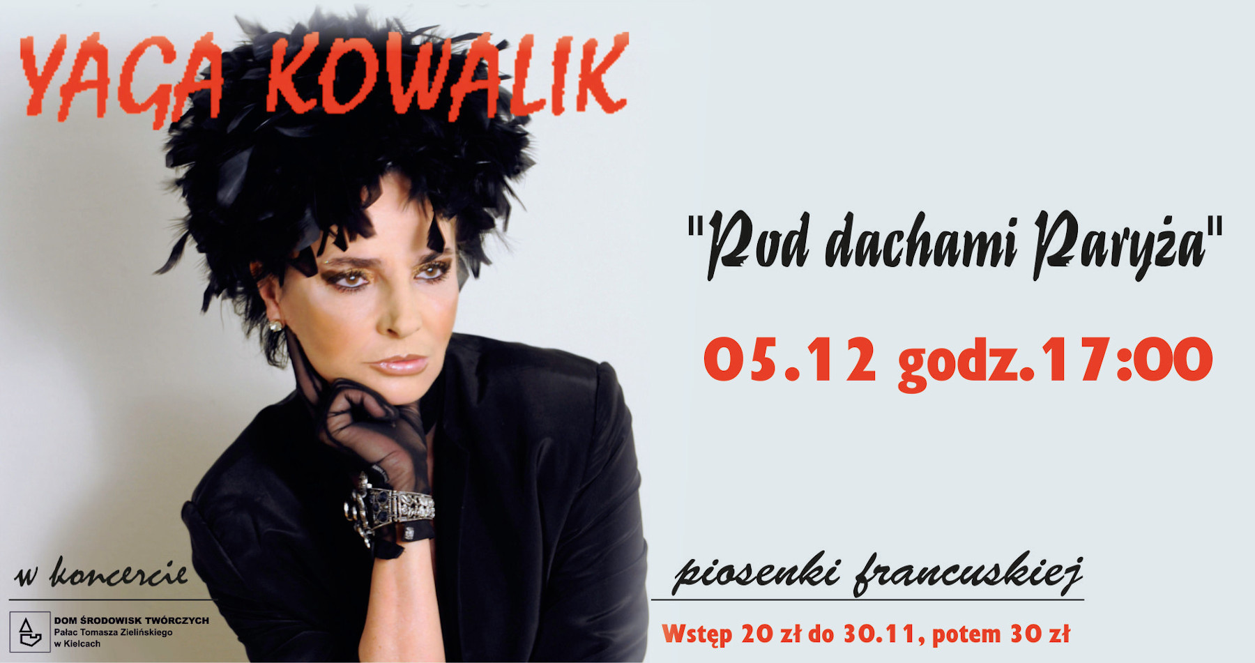 W niedzielę, 5 grudnia o godz. 17:00 w Pałacyku Zielińskiego wystąpi YAGA KOWALIK w koncercie piosenki francuskiej „Pod dachami Paryża”.